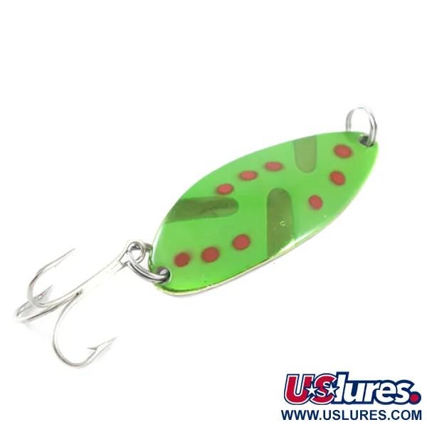 Una vibrante pintura verde con distintos puntos rojos y patrones verde oscuro define el perfil visual de esta cucharilla de 5,5 cm (2 1/4"). En el reverso de níquel pulido está estampada la legendaria figura de la bailarina de hula, un detalle característico de la época en que Seneca Lure Company fabricaba la Little Cleo (Hula Girl) en EE. UU. antes de la adquisición por parte de Acme en los años 80. Con un peso de 18 g (2/3 oz), el señuelo presenta un grosor de metal sustancial y está equipado con un anzuelo triple de calidad y anillas abiertas plateadas. Este ejemplar en particular, con el código de producto 1685, muestra un acabado bien conservado y está calificado con una condición de 5/5. Aunque existen versiones contemporáneas de la Cleo, muchos pescadores veteranos buscan específicamente estos modelos originales 'dancer' por su peso de lanzado y su valor histórico. El estampado permanece nítido y profundo en el reverso de tono plateado.