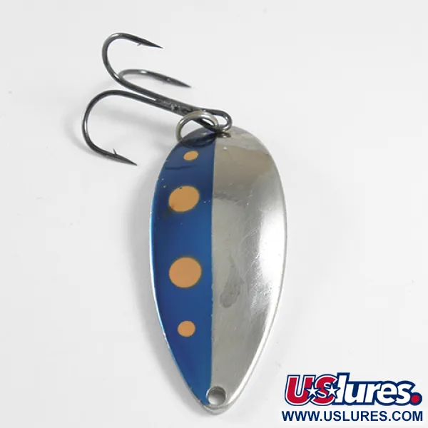Con un peso considerable de 21g (3/4oz), esta cucharilla producida por Seneca presenta el clásico acabado Azul / Rojo / Níquel con un llamativo panel azul salpicado de puntos en tonos cálidos. Con una longitud de 6,5 cm (2 1/2"), este ejemplar lleva el código de producto 1745 y sirve como un ejemplo excelente del diseño original de Seneca Lure antes de que la marca fuera adquirida por Acme a principios de la década de 1980. El reverso está profundamente grabado con la famosa bailarina "Hula Girl" y la marca "WIGL LURE", un detalle muy buscado por los coleccionistas que creen que la silueta fue el secreto de la fama del señuelo. Su superficie de níquel pulido y los herrajes originales están bien conservados, reflejando una calificación de estado 4/5. El cuerpo de metal de calibre grueso está equipado con un robusto anzuelo triple, mientras que la parte superior e inferior están claramente marcadas con el peso y el icónico nombre Little Cleo.