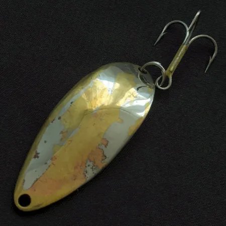 Con un peso de 18g (2/3oz), esta cucharilla clásica es una pieza de historia de la pesca de la marca Seneca Lure. En el reverso destaca el legendario grabado "Hula Girl" junto al texto "WIGL LURE", un detalle que dejó de producirse cuando Acme adquirió la marca en la década de los 80. Con una longitud de 5,5 cm (2 1/4"), este ejemplar presenta un acabado tricolor característico en níquel, latón y cobre. Tiene una valoración de estado de 3/5, mostrando el carácter honesto de un señuelo que ha pasado tiempo en el agua, con el baño original desgastado dejando ver los tonos cálidos del metal subyacente. Para el coleccionista de material de pesca estadounidense, este modelo concreto (Código de producto 22427) representa la época anterior a la simplificación del diseño. El montaje incluye una anilla abierta robusta y un anzuelo triple, listo para el lanzado o curricán. El orificio en el extremo estrecho ofrece un punto de sujeción sencillo y directo para la línea o el bajo.