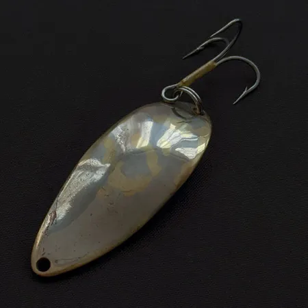 El baño de níquel pulido revela matices de cobre y oro en el reverso de esta cucharilla de 5,5 cm (2 1/4"). Este ejemplar, con el código de producto 22673, representa la época de producción clásica de Seneca Lure antes de que la marca fuera adquirida por Acme a principios de los años 80. Estampado con la emblemática bailarina "Hula Girl" y la marca "WIGL LURE", este señuelo de 18 g (2/3 oz) conserva el carácter que los pescadores veteranos consideran el secreto de su éxito legendario. La imagen de la bailarina es un detalle muy valorado por los coleccionistas, ya que las versiones posteriores abandonaron este grabado tan detallado. Con una valoración de estado de 3/5, la superficie metálica muestra una suave pátina fruto de su tiempo en la caja de pesca, aunque los herrajes siguen siendo robustos. La anilla abierta conecta con un anzuelo triple vintage, que aún conserva su acabado original de tipo bronce.