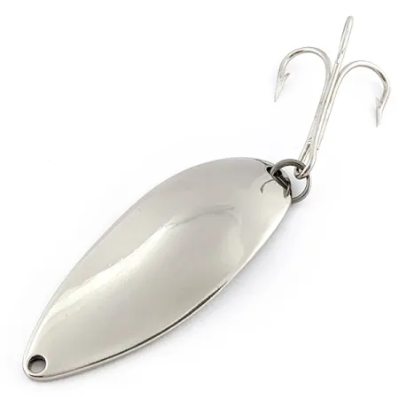 En el reverso de cromo pulido de esta cuchara de 21 g (3/4 oz) se encuentra grabada la icónica silueta de la bailarina, sello distintivo de la producción original de la compañía Seneca Lure conocida como Hula Girl. Con una longitud de 6,5 cm (2 1/2 pulgadas), este ejemplar en particular pertenece a la época anterior a que Acme adquiriera la marca a principios de los años 80 y eliminara el característico motivo de la bailarina de los moldes. Muchos pescadores veteranos sostienen que fue precisamente este gráfico el que consolidó la reputación de éxito de la Little Cleo en el agua. Identificada con el código de producto 22881, el señuelo presenta un cuerpo de metal de gran calibre y un anzuelo triple de gran tamaño sujeto por una anilla abierta resistente. La superficie muestra un acabado de alto brillo, y el estado de esta pieza es un sólido 5/5. El grabado profundo en la parte posterior muestra claramente el nombre de Seneca y su origen en EE. UU., marcándolo como una pieza auténtica de la historia del material de pesca estadounidense.