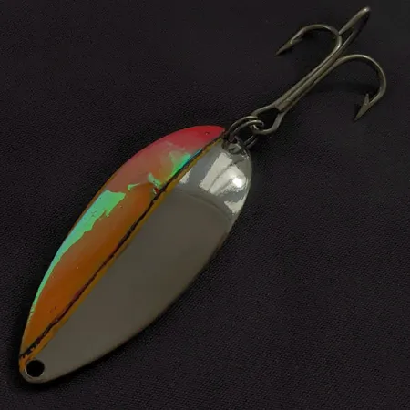 Con un peso de 3/4 oz (21 g), esta cuchara de alta resistencia ofrece la distancia de lanzado necesaria para grandes masas de agua. Este ejemplar concreto, código de producto 22982, presenta un llamativo acabado níquel/rojo, aunque el lado rojo muestra un degradado vibrante que vira hacia tonos naranja cálido y verde lima bajo la luz. Lo que hace que esta Little Cleo (Hula Girl) de la era Seneca sea especial para los coleccionistas es la presencia de la icónica bailarina grabada en el reverso. Antes de que Acme adquiriera Seneca Lure Company a principios de los años 80, cada Cleo auténtica incluía esta hula girl, un detalle que muchos pescadores experimentados aseguran que era el ingrediente secreto de su éxito. Con una medida de 2 1/2" (6,5 cm), la superficie de la pala presenta un estado de conservación 4/5, manteniendo un brillo intenso y una transición de color nítida en su forma asimétrica. Aunque Acme continúa con el legado hoy en día, hace tiempo que retiraron el cuño de la bailarina, lo que convierte a estas versiones originales de Seneca fabricadas en EE. UU. en un hallazgo muy valorado. La cuchara está equipada con un robusto anzuelo triple, lista para su próxima jornada de pesca o para ocupar un lugar de honor en una vitrina de artículos antiguos.