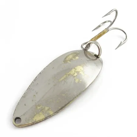 Los acabados en níquel y oro se funden en la superficie de esta cucharilla de 5,5 cm (2 1/4"), mostrando la solera de un señuelo que ha pasado horas en el agua. Este ejemplar específico, con el código de producto 23493, es la cotizada versión "Hula Girl" fabricada por Seneca Lure en EE. UU. En el dorso cóncavo, se aprecia el icónico grabado de la bailarina de hula junto a las marcas "LITTLE CLEO" y "WIG LURE", un detalle que desapareció cuando Acme se hizo cargo de la producción a principios de los 80. Muchos pescadores veteranos sostienen que este grabado era la clave del éxito legendario de este señuelo. Con un peso de 14 g (1/2 oz), permite alcanzar grandes distancias en el lance. Los componentes originales, como la anilla y el anzuelo triple, muestran signos de su carácter vintage, con una calificación de estado de 3/5. Es una pieza auténtica de la historia de la pesca de la era anterior a la simplificación del diseño para la producción masiva.