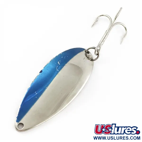 Con un peso de 3/4 oz (21 g), esta cucharilla es una pieza significativa de la historia de la pesca estadounidense. El frontal de la pala presenta un acabado en níquel limpio, acentuado por una franja de pintura azul vibrante aplicada a lo largo de un borde. En el reverso, la icónica bailarina "Hula Girl" está profundamente grabada en el metal, un sello distintivo de la producción original de Seneca antes de que la marca fuera adquirida por Acme a principios de los años 80. Los coleccionistas suelen buscar estas Little Cleo fabricadas por Seneca específicamente por ese logotipo de la bailarina, que no aparece en las versiones modernas. Este ejemplar, identificado con el código de producto 24050, mide 2 1/2" (6,5 cm) y se conserva en un estado 5/5, luciendo muy bien preservado. El reverso también incluye el nombre de Seneca y la inscripción "Made in USA" grabados, junto con un anzuelo triple fiable y un montaje de anilla abierta.