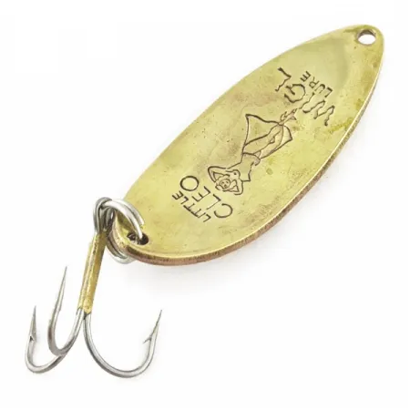 Con un peso de 1/2 oz (14 g), esta cucharilla vintage muestra el perfil clásico que convirtió a los señuelos Seneca en un elemento indispensable en las cajas de pesca de mediados de siglo. El frontal en tono dorado está grabado con los textos 'LITTLE CLEO' y 'WIGL LURE', centrados alrededor del icónico grabado de la bailarina 'Hula Girl'. Con una longitud de 2 1/4 pulgadas (5,7 cm), el cuerpo pasa a un reverso niquelado donde se aprecian señales de uso, acordes con su estado de conservación 3/5. Estos modelos de la era Seneca son muy valorados en comparación con las versiones modernas de Acme porque conservan la ilustración detallada de la bailarina. El montaje incluye una anilla abierta robusta que sujeta un anzuelo triple clásico, diseñado para técnicas tradicionales de lanzado o curricán. Identificado con el código de producto 24089, el señuelo mantiene su integridad estructural a pesar de cierto desgaste del niquelado en la parte posterior.