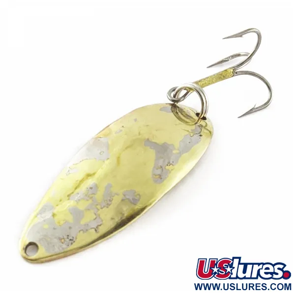 Un acabado de latón recubre el perfil en forma de lágrima de este clásico fabricado por Seneca, un señuelo esencial para los pescadores de trucha y salmón de mediados de siglo. Con una longitud de 5,5 cm (2 1/4") y un peso de 14 g (1/2 oz), este ejemplar específico porta el código de producto 24103. El reverso de la cucharilla presenta el icono grabado de la bailarina que le valió el apodo de "Hula Girl" antes de que Seneca fuera adquirida por Acme a principios de los años 80. Las versiones posteriores de la Cleo omitieron este gráfico, el cual muchos pescadores experimentados consideran el secreto del éxito del diseño original. Se aprecia un ligero plateado a través del baño de latón en la cara convexa, otorgando al metal un aspecto auténtico y usado que se califica con un estado de 3/5. Una anilla abierta de gran grosor sujeta el anzuelo triple original a la cola del cuerpo de metal estampado.