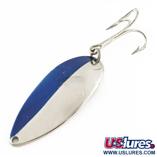 Con una franja azul intenso sobre una base de níquel pulido, esta cucharilla de 3/4 oz (21 g) es un ejemplo excepcional de la artesanía de aparejos estadounidenses de mediados de siglo. Los coleccionistas reconocen de inmediato la distintiva bailarina grabada en el reverso, conocida comúnmente como "Hula Girl", un sello distintivo de la producción original de Seneca Lure Company antes de que la marca pasara a manos de Acme a principios de los años 80. Con una longitud de 2 1/2" (6,5 cm), este ejemplar con el código de producto 24174 se conserva en un estado excepcional de 5/5, manteniendo las líneas nítidas de la figura grabada que muchos pescadores consideran el secreto del éxito de este señuelo. Su construcción en metal de gran calibre y el robusto anzuelo triple plateado reflejan su origen estadounidense, fabricado específicamente para alcanzar grandes distancias de lanzado. Su superficie reflectante es notablemente clara, envejeciendo con elegancia y manteniendo un brillo intenso tanto en las zonas pintadas como en las metálicas.
