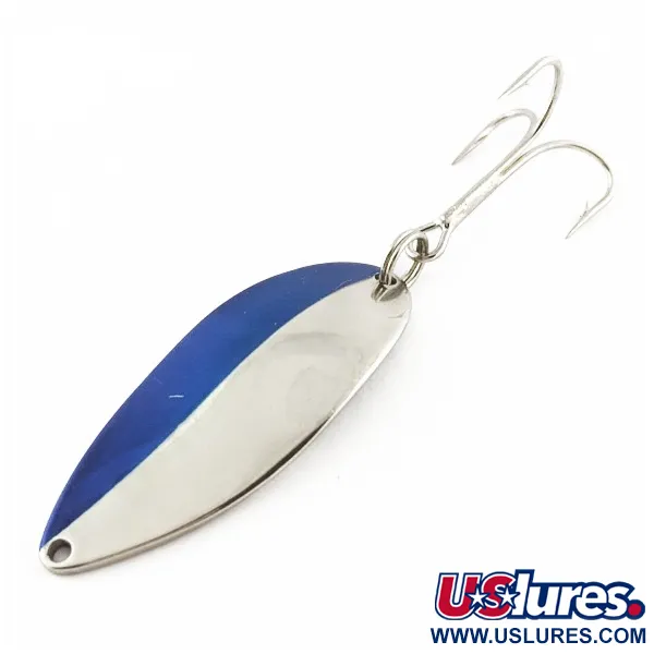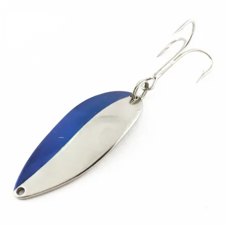Con un peso de 3/4 oz (21 g), esta pieza transmite la robustez propia de una cuchara de lance pesado. El acabado en níquel y azul se conserva excepcionalmente limpio, reflejando el niquelado de alta calidad característico de la Seneca Lure Company antes de su adquisición por parte de Acme a principios de los 80. Al observar el reverso de su cuerpo de 2 1/2" (6,5 cm), se aprecia el distintivo sello "Hula Girl", un detalle que, según muchos coleccionistas veteranos, forjó la legendaria reputación de la Little Cleo. Este modelo en particular, identificado con el código 24198, mantiene todos sus componentes originales, incluyendo el resistente anzuelo triple y su anilla abierta. El detalle del grabado es la marca de identidad de estos primeros señuelos fabricados en EE. UU., ya que las versiones actuales de Acme han suprimido la figura de la bailarina. Hallar un ejemplar en un estado 5/5 como este es un privilegio para los amantes de la era de transición en la industria de pesca americana. El lacado azul cubre la mitad de la cara convexa, generando un contraste nítido con la superficie de níquel pulido.