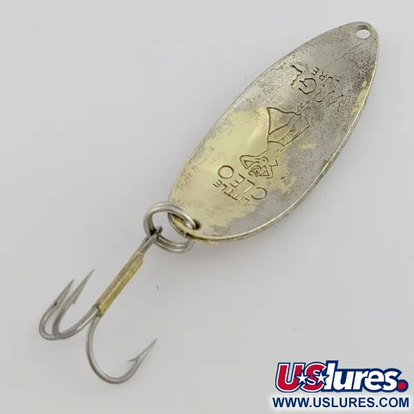 El estampado de la icónica figura "Hula Girl" en el reverso identifica inmediatamente a esta cucharilla de 1/2 oz (14 g) como una Little Cleo clásica de la era original de Seneca. Con una longitud de 5,5 cm (2 1/4"), este ejemplar presenta un acabado bitono de níquel y latón que muestra el carácter honesto de una caja de pesca con mucha historia, lo que le otorga una calificación de estado de 3/5. Antes de la adquisición por parte de Acme Tackle a principios de la década de 1980, la Seneca Tackle Company de Nueva York fabricaba estas cucharillas con el grabado detallado de la bailarina, una adición inspirada en una bailarina exótica que el compositor C.V. "Charlie" Clark vio en la década de 1930. Muchos pescadores veteranos todavía aseguran que el logotipo de la bailarina es un amuleto de la suerte para la trucha y el salmón de los Grandes Lagos. Este señuelo específico, identificado con el código de producto 24443, cuenta con herrajes clásicos de calibre grueso y un anzuelo triple sujeto por un resistente anilla abierta. El latón base asoma a través del niquelado en el lado convexo, ofreciendo un contraste visual distintivo que difiere de las reediciones modernas.