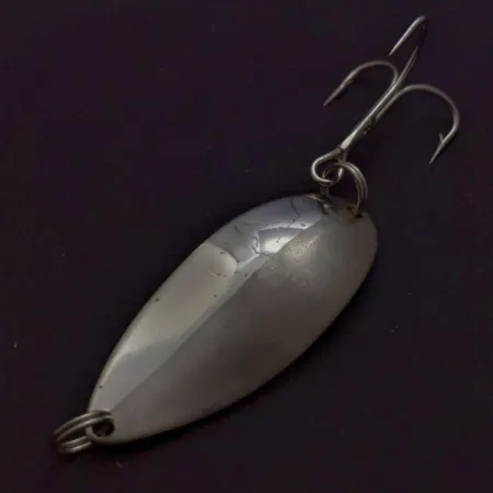 Un acabado de níquel de doble textura define el lado convexo de esta cucharilla de 21 g, combinando una superficie de espejo pulida con un sutil cepillado mate. Conocida entre los pescadores experimentados como el modelo Hula Girl, este original de Seneca Lure Co. lleva la silueta estampada de una bailarina en el reverso, una característica que se perdió cuando la producción cambió de manos a principios de la década de 1980. Con una longitud de 6,5 cm, el cuerpo de metal grueso está diseñado para alcanzar grandes distancias de lanzado. El niquelado está bien conservado, con una calificación de 4/5 por sus superficies limpias y su estampado nítido. Esta cucharilla específica fabricada por Seneca representa la era anterior a que el detalle de la bailarina fuera eliminado del molde. Código de producto: 24606.