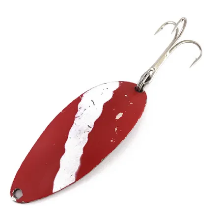 Con un peso de 1/2 oz (14 g), este ejemplar presenta el esquema de color clásico Rojo / Blanco / Níquel en su cuerpo de 5,5 cm (2 1/4"). El reverso con acabado de níquel lleva el distintivo sello de la bailarina "Hula Girl", un detalle característico de la época en que la Seneca Lure Company producía originalmente estos señuelos antes de la adquisición de Acme a principios de los años 80. La mayoría de las versiones modernas carecen de esta figura en relieve, lo que convierte a este ejemplo con código de producto 8087 en una pieza tangible de la historia de la pesca. La cara frontal se caracteriza por una gruesa franja blanca diagonal sobre una base roja profunda, mostrando un ligero desgaste superficial consistente con una calificación de estado de 4/5. Un único anzuelo triple plateado está unido a la parte trasera mediante un anilla abierta, mientras que el orificio para el sedal en la parte delantera permanece limpio y bien definido.