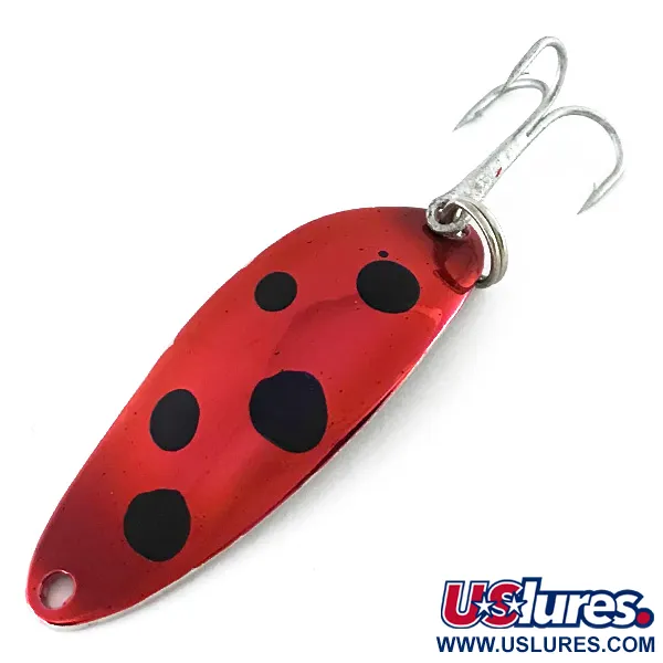 Con un peso de 1/3 oz (10 g), esta cucharilla clásica luce un vibrante acabado rojo salpicado de llamativos puntos negros. El reverso revela el profundo estampado de la bailarina «Hula Girl», sello distintivo de la producción original de la empresa Seneca Lure antes de que Acme adquiriera la marca a principios de los ochenta. Los coleccionistas suelen buscar este cuño específico, ya que las versiones modernas lamentablemente han omitido la icónica figura que muchos pescadores veteranos consideran el secreto de su éxito. Con una longitud de 4,5 cm (1 3/4"), el señuelo cuenta con un dorso de níquel pulido y está equipado con una anilla abierta robusta y una potera afilada. Este ejemplar, con código de producto 8364, se mantiene en excelente estado con una calificación de 5/5, preservando el legado de la fabricación estadounidense de señuelos de una época pasada.