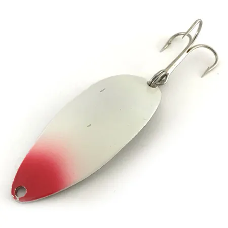 Con un peso de 1/2 oz (14 g), esta auténtica cucharilla Seneca Little Cleo (Hula Girl) luce la icónica imagen grabada de la bailarina en su reverso niquelado. Este ejemplar específico, catalogado con el código de producto 8715, presenta un acabado blanco perla acentuado por un llamativo morro rojo en el frente. Con una medida de 2 1/4" (5,5 cm), el señuelo representa la era de producción original de la compañía Seneca Lure con sede en EE. UU., previa a la adquisición de la marca por Acme a principios de los años 80. Los coleccionistas buscan con frecuencia estas versiones vintage porque el grabado distintivo Hula Girl fue finalmente eliminado en las iteraciones modernas. Su construcción consiste en un cuerpo de metal de calibre pesado equipado con un robusto anilla abierta y un anzuelo triple plateado. Las superficies están notablemente limpias, obteniendo una calificación de estado de 5/5 por su pintura bien conservada y su acabado de níquel brillante.