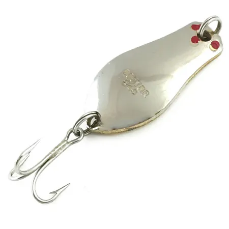 El níquel pulido cubre un lado de esta cucharilla de 3 cm (1 1/4"), mientras que el reverso revela un acabado dorado en contraste. Claramente troquelada con el nombre "DOCTOR 245", la cara de níquel presenta tres característicos puntos rojos cerca del ojal. Con un peso exacto de 5,5 g (3/16 oz), esta cucharilla fabricada en EE. UU. por la Prescott Spinner Company está equipada con su potera y anillas abiertas originales. Las superficies metálicas de este modelo, catalogado bajo el código de producto 6015, han mantenuto su brillo intenso en ambas variantes de color. El estado general de este artículo de colección está calificado como 5/5.