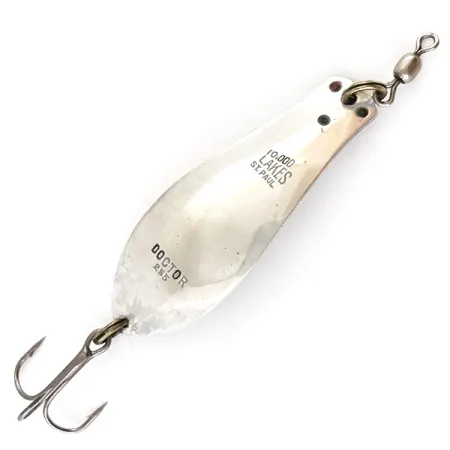 El niquelado en la cara frontal de esta cucharilla ondulante de 7 g (1/4 oz) está grabado con las marcas "10,000 LAKES ST. PAUL" y "DOCTOR 255", lo que la identifica como un clásico de la historia de la pesca en Minnesota. Fabricada por Prescott Spinner bajo el código de producto 4989, la Little Doctor 255 presenta un marcado contraste entre su cara de níquel brillante y el reverso en tonos dorados cálidos. Con una longitud de 4,7 cm (1 3/4"), el señuelo está montado con un robusto anzuelo triple y un quitavueltas de barril en el enganche. Este ejemplar específico mantiene una calificación de estado de 4/5, mostrando sutiles signos de su origen vintage mientras permanece notablemente limpio. La forma de lágrima de la cucharilla es un diseño característico de la empresa estadounidense, destinado a aplicaciones de lanzado versátiles.