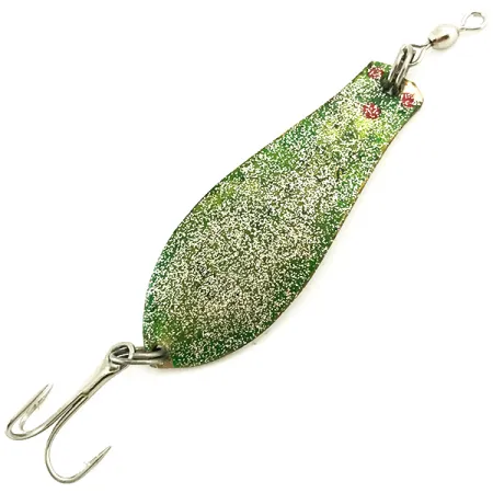 Acabados Golden Glitter y Green Glitter cubren las superficies de esta cucharilla metálica de 4,7 cm, un sello distintivo de la marca Prescott Spinner. Con un peso de 7 g, la Little Doctor 255 presenta un perfil de lágrima diseñado para lance o curricán. Una serie de puntos rojos son visibles cerca de la cabeza del lado verde, proporcionando un punto de ataque para peces depredadores. Este ejemplar, identificado con el código de producto 5689, conserva sus componentes originales, incluyendo un anzuelo triple afilado y un esmerillón de barril montado en la parte superior. El estado se califica en 5/5, mostrando superficies notablemente bien conservadas y colores vibrantes que permanecen claros y brillantes. Fabricado originalmente en USA, este señuelo muestra los estilos de acabado populares en los señuelos metálicos americanos de mediados de siglo donde la purpurina se aplicaba densamente para maximizar la visibilidad bajo el agua. Las anillas abiertas permanecen apretadas.