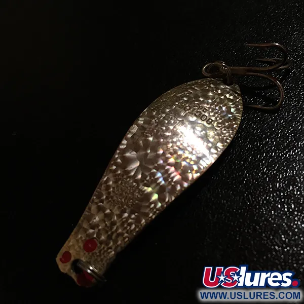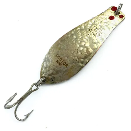 Las texturas martilladas en el reverso del cuerpo metálico de 1/4oz (7g) contrastan maravillosamente con el exclusivo acabado holográfico Crystal dorado del frente. En el metal están grabadas claramente las marcas 10,000 LAKES ST. PAUL junto con la designación del modelo DOCTOR 255, identificando sus orígenes Prescott Spinner en Minnesota, EE. UU. Con una longitud de 1 3/4" (4,7 cm), este ejemplar se encuentra en un estado excepcional, con una calificación de 5/5, conservando intactos su superficie dorada reflectante y sus detalles en rojo. El montaje incluye un anzuelo triple estándar en la base, diseñado para lanzados o curricán. Esta versión específica, identificada con el código de producto 5470, destaca por las propiedades únicas de reflexión de la luz de su cara texturizada de cristal dorado.