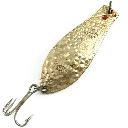Claramente troquelada en el metal martillado se encuentra la marca 'DOCTOR 255' junto a su origen en St. Paul, MN. Con un peso de 1/4 oz (7 g), esta cucharilla presenta un acabado Crystal Golden con una textura de hoyuelos profundos diseñada para reflejar la luz durante la recogida. El cuerpo metálico mide 1 3/4" (4,7 cm) y está en una condición 5/5, mostrando una superficie brillante y limpia. Un distintivo punto rojo cerca del ojal superior proporciona un toque de color localizado sobre el chapado dorado. Catalogado bajo el código 6168, el señuelo está equipado con un anzuelo triple y anillas abiertas en excelente estado. Esta clásica cucharilla de fabricación estadounidense confía en su diseño pesado y cónico para un rendimiento eficaz en el lanzado o curricán.