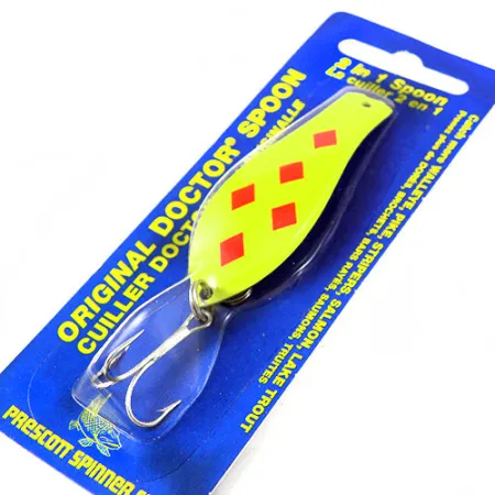Llamativos diamantes rojos contrastan fuertemente con la base amarilla vibrante de esta cucharilla de 1/3 oz (10 g). Identificada con el código 0780, la Little Doctor 265 mide 2 1/2" (6,5 cm) y se conserva en su cartón azul original. Este ejemplar está sin usar, manteniendo el esmalte de fábrica intacto y el anzuelo triple afilado. Como modelo de Prescott Spinner, división de la reconocida Fred Arbogast, este señuelo fabricado en EE. UU. lleva la clásica designación '2 in 1 Spoon' en el cartón. El acabado amarillo proporciona una alta visibilidad, mientras que el nombre 'Doctor Spoon' y la marca están grabados claramente en el reverso de metal.