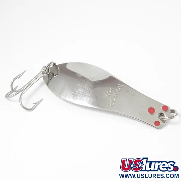 El niquelado de este cuerpo de 6,5 cm refleja la luz con un acabado de espejo limpio, típico de los señuelos Prescott Spinner de alta calidad. Grabada claramente en el metal, la identificación "DOCTOR 265" va acompañada de tres distintivos puntos rojos situados cerca del enganche. Con un peso di 10 g, esta cucharilla fabricada en EE. UU. está diseñada para el lance o el curricán. Los componentes incluyen un anzuelo triple afilado y anillas abiertas dobles, todo en un estado excepcional. Este ejemplar, con el código 2584, tiene una calificación de estado de 5/5, conservando el color níquel brillante en todo su perfil alargado. La clásica forma de lágrima se estrecha hacia la parte superior, donde el metal es ligeramente más angosto para el enganche de la línea.