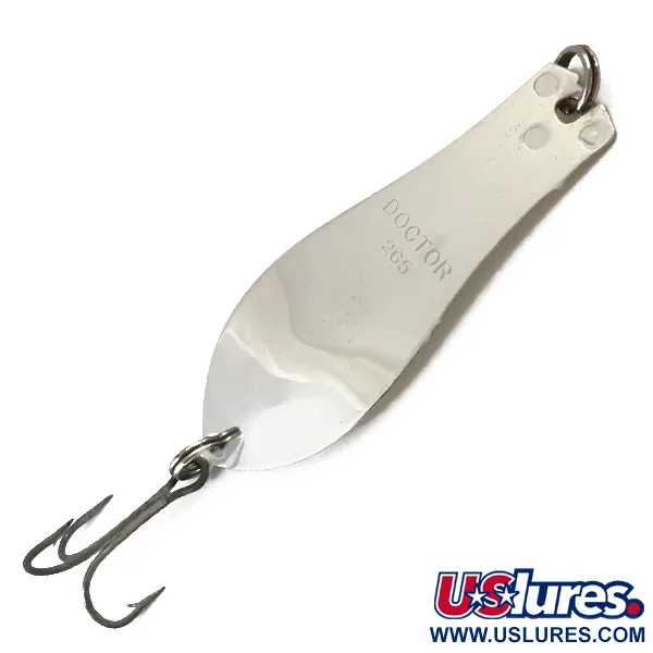Una longitud de 2 1/2 pulgadas (6,5 cm) caracteriza a esta cucharilla Prescott Spinner, un diseño que sigue siendo un elemento básico para los coleccionistas de aparejos americanos de mediados de siglo. Con un peso de 1/3 oz (10 g), el cuerpo de metal tiene grabado 'DOCTOR 265' en su cara niquelada, lo que significa su herencia como parte de la familia de señuelos Fred Arbogast. Este ejemplar, identificado con el código de producto 4904, presenta un acabado bitono distintivo con níquel pulido en el frente y un reverso chapado en oro. El herraje incluye un robusto anclaje de anilla abierta para la línea y un anzuelo triple afilado sujeto por una anilla en la cola. Con una calificación de 5/5, las superficies están excepcionalmente limpias, mostrando el brillo original de ambos acabados metálicos. La fabricación se llevó a cabo en los EE. UU., cumpliendo con los altos estándares de producción de la época.