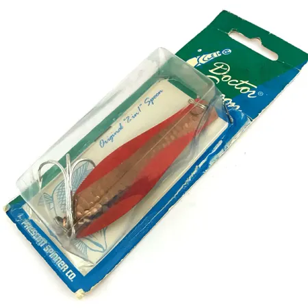 Las texturas de cobre martilleado combinadas con una cara de espirales naranja vibrante definen la estética clásica de este ejemplar de Prescott Spinner. Con un peso de 3/4 oz (21 g), el Little Doctor 275 está diseñado para la versatilidad, comercializado históricamente como una cucharilla "2 en 1" porque permite colocar el anzuelo en cualquier extremo para modificar la presentación. Este señuelo específico, catalogado bajo el código de producto 8680, permanece guardado en su blíster original de época. El equipo cuenta con un anzuelo triple sustancial y afilado, diseñado para los rigores de la pesca del lucio, el muskie o la trucha de lago. Mientras que el lado martilleado proporciona destellos reflectantes, el lado de espirales de alto contraste está pensado para la visibilidad durante el curricán, el lanzado o el jigging profundo. Al no haber sido extraído nunca de la tarjeta de soporte producida por KOTCO Manufacturing, el señuelo está sin usar. El envase proporciona orientación técnica para diferentes profundidades, sugiriendo la fijación de la línea en el extremo ancho para un movimiento más amplio o en el extremo estrecho para aplicaciones en aguas profundas.