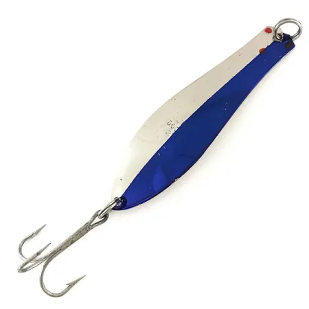 Un peso de 21 g proporciona a la Prescott Spinner Little Doctor 275 el lastre necesario para el lanzado o el curricán. La parte delantera de la cucharilla presenta un impecable acabado dividido Níquel / Azul, resaltado por un pequeño detalle de ojo pintado en rojo cerca del anillo de sujeción. El código 9106 está claramente grabado en el cuerpo metálico, sirviendo como identificador fiable para este señuelo vintage fabricado en EE. UU. Con 9 cm de longitud, el señuelo mantiene un perfil esbelto con el reverso totalmente niquelado que refleja la luz en la columna de agua. Este ejemplar se encuentra en un estado 5/5, con superficies notablemente limpias tanto en el cuerpo metálico como en el anzuelo triple original.