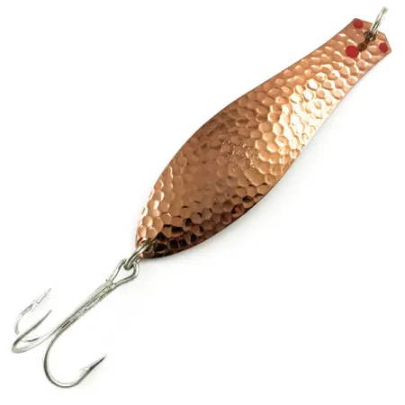 Los acabados en cobre martillado como el de este modelo fueron diseñados para captar y reflejar la luz en varias direcciones, una técnica muy apreciada por el fabricante estadounidense Prescott Spinner. Con un peso de 17 g (3/5 oz), el Little Doctor 275 Lite (Código 6030) presenta una superficie martillada distintiva en su cara convexa que contrasta con el cobre liso y pulido del reverso. Dos pequeños detalles en pintura roja se ubican cerca del enganche superior, proporcionando un sutil punto de atención sobre el cálido tono metálico. Con una longitud de 9 cm (3 1/2"), la cucharilla está equipada con un robusto anzuelo triple de acabado plateado asegurado por una anilla abierta reforzada. Los sellos del fabricante son claramente visibles en el metal, reflejando su origen USA. Este ejemplar se encuentra en excelente estado, con una calificación de 5/5, herrajes limpios y un acabado brillante. El anzuelo de gran calibre y su cuerpo metálico sólido sugieren un señuelo fabricado para lances y curricán donde la durabilidad es esencial.