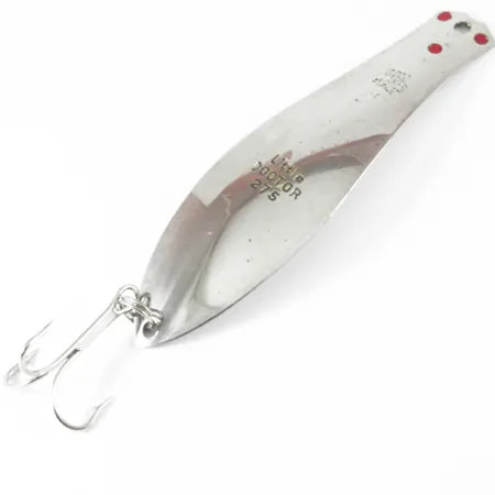 Con un peso de 3/5 oz (16g), esta variante específica "Thin" del Little Doctor fue diseñada para la pesca al curricán, donde se prefiere un perfil más ligero y estilizado frente a los modelos de lanzado más pesados. El acabado en níquel pulido se acentúa con tres puntos rojos distintivos situados cerca del enganche de la línea, un elemento de diseño característico de la Prescott Spinner Company de Prescott, Wisconsin. Con una longitud de 3 1/2" (9 cm), la cara de la cucharilla está claramente troquelada con la denominación del modelo "Little DOCTOR 27S" junto con el origen del fabricante. Este ejemplar está en condición 5/5, conservando su superficie brillante y reflectante y su anzuelo triple original en tono plateado. El diseño incorpora una anilla abierta en la cola, lo que garantiza que los herrajes se mantengan seguros durante largas jornadas de curricán. Fabricado en EE. UU., el señuelo representa la sencillez funcional de los aparejos vintage de mediados de siglo, utilizando un cuerpo cónico para alcanzar la profundidad deseada sin un volumen excesivo. La parte inferior tiene el mismo acabado en níquel de alto brillo, proporcionando destellos constantes desde múltiples ángulos.