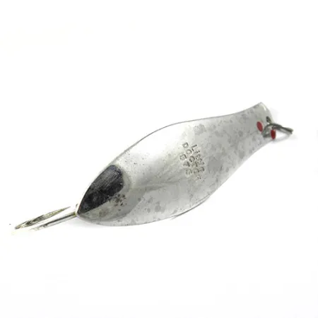 Grabado claramente en el metal plateado, el nombre "LITTLE DOCTOR 575" identifica a esta cucharilla de 21g (3/4oz) como un diseño antihierba clásico de Prescott Spinner. Este ejemplar fabricado en EE. UU., catalogado con el código 1175, presenta dos marcas rojas distintivas en el enganche que contrastan con el cuerpo metálico. Su equipamiento incluye un anzuelo simple de alta resistencia fijado en la parte inferior, protegido por un protector de cables diseñado para lanzar directamente en vegetación densa o nenúfares. Con una longitud de 9 cm (3 1/2"), la cucharilla muestra algunos ligeros signos de uso en su superficie reflectante, aunque se mantiene en un estado sólido de 4/5. La anilla abierta en la cabeza está intacta, proporcionando una conexión segura para pescar en entornos donde los enganches son comunes.