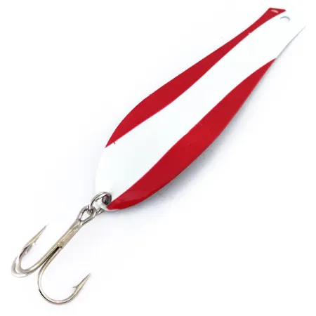 Con su icónica pintura de rayas diagonales rojas y blancas en la cara frontal, esta cucharilla para curricán es la variante más fina y estilizada del diseño clásico. Con una longitud de 11 cm (4 1/4") y un peso de 17 g (3/5 oz), la Little Doctor troll fue fabricada por la empresa Prescott Spinner en EE. UU. para soportar las exigencias específicas del curricán desde embarcación. Al girar el señuelo, se descubre un reverso de níquel pulido que proporciona un destello brillante contra el frente pintado. Identificado con el código de producto 9926, este ejemplar se encuentra en un estado 5/5, mostrando un acabado impecable tanto en el metal como en las superficies pintadas. El montaje consta de un anzuelo triple afilado sujeto mediante una anilla abierta al ojal trasero, con un punto de fijación similar en la cabeza para asegurar el señuelo al aparejo de curricán.