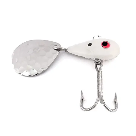 Con un peso de 1/2 oz (14 g), este tail spinner en forma de gota es un señuelo hundido de alta resistencia diseñado para alcanzar estructuras profundas. El cuerpo de plomo de 1 1/2" (4 cm) tiene un acabado de pintura blanca limpia, acentuado por ojos pintados a mano con bordes rojos y pupilas negras. Producido por Luhr Jensen bajo el código de producto 10292, el modelo cuenta con una pala con acabado de níquel que ofrece un doble atractivo visual. Un lado de la pala está martilleado para maximizar los destellos en diversas condiciones de luz, mientras que el reverso liso está claramente grabado con el nombre "LITTLE GEORGE". Este señuelo se encuentra en un estado 5/5, manteniendo el brillo original de su pintura y sus componentes metálicos relucientes. Un único anzuelo triple afilado está sujeto a la barriga mediante un robusto arnés de alambre que atraviesa el cuerpo de plomo. Su perfil compacto y su construcción densa están diseñados específicamente para lograr distancia de lanzado y un descenso rápido para alcanzar bancos de peces suspendidos o depredadores de fondo.