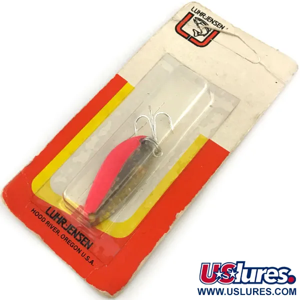 La textura de latón martillado en el lado convexo proporciona una superficie de gran destello que contrasta con el vibrante acabado rojo fluorescente de la cara. Con una medida de 1 1/2" (4 cm) y un peso de 1/4 oz (7 g), esta cucharilla vintage Luhr Jensen Little Jewel es una pieza clásica de la historia de Hood River, Oregón. Aún conservada en su blíster original, la cucharilla está sin usar, lo que representa una condición de grado 6 para coleccionistas. El reverso de la tarjeta conserva la pegatina original del código de barras con el código de producto 1013-014-399, que la identifica específicamente como una "Edición Especial" fabricada en 10-94. Diseñado para la versatilidad, el recubrimiento fluorescente está concebido para una alta visibilidad, reaccionando bajo la luz UV para atraer la atención en aguas profundas. El herraje consiste en un anzuelo triple de plata brillante y una anilla abierta robusta, típicos de la construcción duradera por la que Luhr Jensen era conocida antes de que cesara la producción de este modelo. Este ejemplar sirve como ejemplo preservado de los estándares de fabricación de mediados de los 90, desde el arte litografiado de la tarjeta hasta el estampado específico del metal.