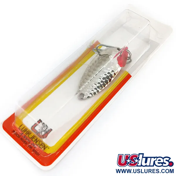 Los hoyuelos profundamente texturizados en el cuerpo de níquel martilleado proporcionan un perfil de gran destello a esta cucharilla ondulante de 14g (1/2oz). Esta Luhr Jensen Little Jewel sin usar permanece en su embalaje original, con los clásicos gráficos rojos y amarillos de la época de Hood River, Oregon. Una pequeña lengüeta atractora de plástico rojo está montada en la anilla abierta trasera junto al anzuelo triple para añadir un punto de contraste visual. Con una longitud de 5,5 cm (2 1/4"), el señuelo se identifica por el código de producto 9673 y el SKU 1233-999-0101 en el reverso de la tarjeta. La parte posterior del embalaje también muestra una fecha de producción de 2005 e instrucciones bilingües, destacando la herencia norteamericana de este señuelo vintage.