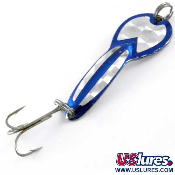 En el reverso del cuerpo metálico están troquelados el identificador "LOCO" y la marca de tamaño "2". Con un peso de 7 g (1/4 oz) y una longitud de 5 cm (2"), este clásico de Glen Evans es identificable por su vibrante acabado azul combinado con una incrustación de holograma geométrico plateado. Para el coleccionista que busca variaciones específicas, este modelo lleva el código de producto 4400. Aunque está diseñado para lance o curricán, es especialmente adecuado para la pesca de lucio en aguas quietas a profundidades de hasta 1 m (3,3 ft). El señuelo es conocido por tener una acción muy activa durante la recogida. En cuanto al estado físico, el recubrimiento azul se mantiene brillante con un ligero desgaste visible en los bordes, lo que le otorga una calificación de estado de 5/5. Está acabado con anillas abiertas de estilo original y un anzuelo triple afilado.