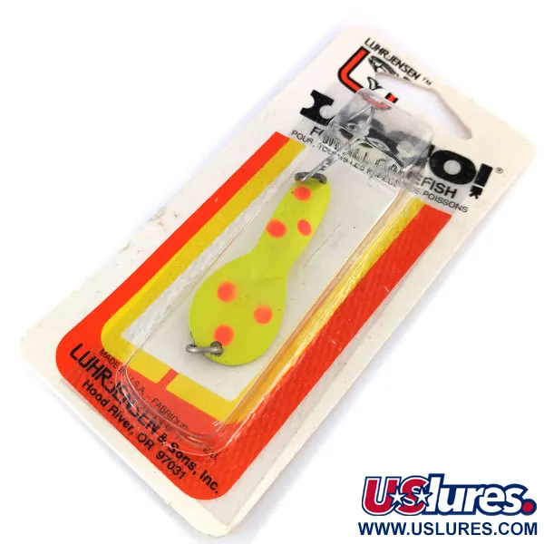 Con una longitud exacta de 2" (5 cm), este ejemplar cuenta con un acabado especializado reactivo a los rayos UV que cobra vida en condiciones de poca luz. La base amarilla vibrante contrasta con puntos brillantes de color naranja-rojo, un esquema de colores diseñado para una visibilidad máxima al pescar a profundidades de hasta 0,9 m (3 pies). Esta cucharilla de 1/4 oz (7 g) se conserva en su embalaje vintage original de Luhr Jensen de Hood River, Oregón, identificado con el código de producto 10000. Como ejemplar con una calificación de estado 6, está sin usar y mantiene el brillo original de fábrica en su superficie curva. El reverso presenta un acabado de níquel para proporcionar un destello metálico junto con la pintura fluorescente. Históricamente, estos señuelos se utilizaban tanto para técnicas de lanzado como de curricán, siendo particularmente efectivos para el lucio o los salmónidos en aguas poco profundas. Los componentes de alta resistencia y el cuerpo de metal estampado reflejan los estándares de fabricación de la era en que la marca producía en USA. Las propiedades de brillo bajo luz ultravioleta hacen de esta variación una pieza notable para coleccionistas centrados en la tecnología de pintura funcional de finales del siglo XX.