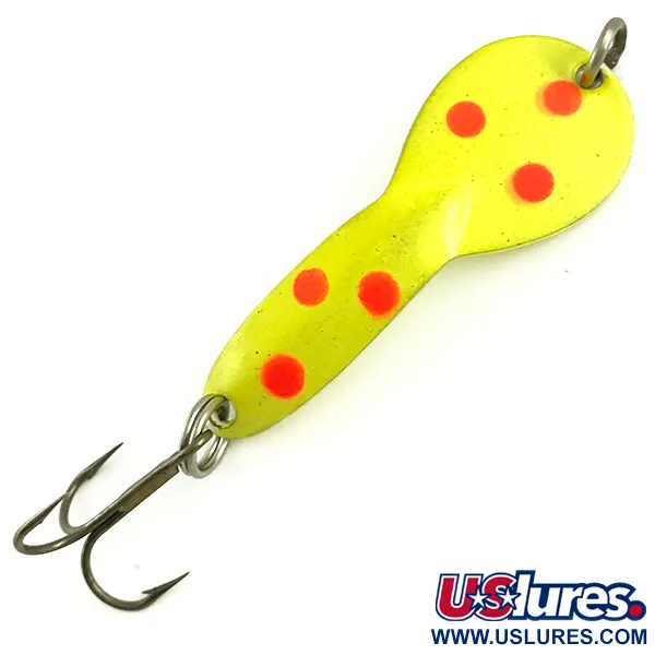 Seis puntos rojos bien definidos están posicionados con precisión sobre la cara amarilla fluorescente de esta cucharilla ondulante Glen Evans Loco 2 UV de 7g (1/4oz). Con una longitud de 5 cm (2"), este modelo específico cuenta con un acabado de alta visibilidad diseñado para reaccionar a la luz ultravioleta, lo que resulta especialmente efectivo en aguas turbias o condiciones de poca luz. El reverso muestra una base de níquel limpia con el identificador "LOCO 2" estampado cerca del ojal superior. Diseñado tanto para lance como para curricán, este señuelo se utiliza habitualmente para el lucio en aguas tranquilas a profundidades de hasta 1 m (3,3ft). Este ejemplar, catalogado con el código 5790, se encuentra en un estado 5/5, sin señales de uso en la pintura ni en los herrajes. Unas anillas abiertas robustas sujetan un anzuelo triple afilado en la cola, manteniendo intacta la configuración original de fábrica.