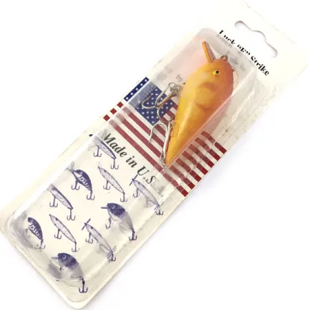 Con una longitud de 5 cm (2"), el perfil de este Rogers Big Jim refleja un diseño clásico americano de la trayectoria de Luck E Strike. Este señuelo de 7 g (1/4 oz), identificado con el código de producto 21279, posee una flotabilidad positiva ideal para pescar en aguas someras. Su acabado consta de un cuerpo en color naranja amarillento que se oscurece hacia el lomo, complementado con ojos amarillos de diseño sencillo. Tradicionalmente, este modelo ha sido empleado tanto para lance como para curricán en la pesca de lucio, perca y aspio. El montaje incluye dos anzuelos triples plateados situados en el vientre y la cola. Diseñado para trabajar en la capa superior de la columna de agua, alcanza una profundidad de 0,3 a 0,9 m (1-3 pies). Esta unidad no ha sido utilizada y se mantiene en su blíster original de época, destacando su procedencia 'Made in U.S.A.' de Cassville, Missouri. El cartón trasero incluye el logotipo clásico de Luck 'e' Strike y un diagrama con las diferentes formas de señuelos fabricados en aquel entonces.
