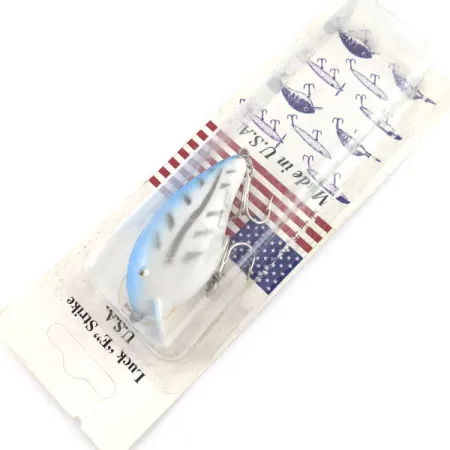 Escamas con matices azules decoran el cuerpo blanco de este crankbait flotante de 5 cm (2"), una pieza vintage con un peso de 7 g (1/4 oz). Catalogado bajo el código de producto 21356, se conserva sin usar en su blíster original de diseño patriótico, que resalta su herencia estadounidense con un llamativo motivo de la bandera. Su construcción está orientada específicamente a la pesca en aguas poco profundas, alcanzando una profundidad de inmersión de 0,3 a 0,9 m (1 - 3 pies). Apto para lanzado o curricán, históricamente se recomendaba para capturar aspios, percas y lucios. El reverso del cartón permite conocer la historia de la empresa, mencionando la sede de Luck “E” Strike USA en Cassville, MO, y su distribución por Ken International Inc. El acabado de este ejemplar está impecable, manteniendo las marcas laterales tipo costillas y el color blanco brillante de la panza.