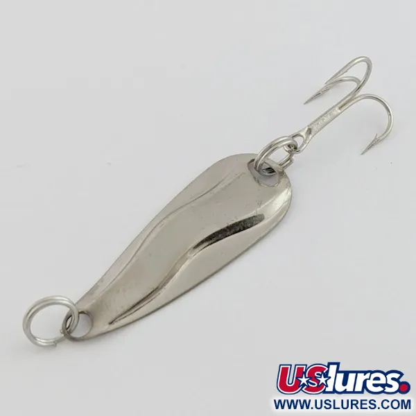 Con la inscripción HOT SHOT W claramente grabada en el reverso, el cuerpo del señuelo presenta un distintivo perfil ondulado de triple contorno que lo diferencia de las cucharillas planas tradicionales. Este espécimen de Luhr Jensen tiene un acabado en níquel de alto brillo, mide 3 cm (1 1/4") de largo y pesa unos delicados 1,3 g (3/64 oz). La configuración de los herrajes incluye un anzuelo triple instalado de fábrica y anillas abiertas tanto en la cabeza como en la cola para opciones de montaje versátiles. Diseñado para el lanzado técnico o el curricán ligero en agua dulce, este modelo es una herramienta especializada para los pescadores de trucha y steelhead con equipos ligeros. La superficie metálica está en excelente estado (puntuación 5/5), mostrando un brillo reflectante en toda su forma. Las especificaciones técnicas de esta pieza están registradas bajo el código de producto 24441.