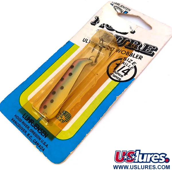 Con un peso de 1/4 oz (7 g), este Hus-lure vintage representa una era clásica de la producción de Luhr Jensen en Hood River, Oregón. La cucharilla mide 2" (5 cm) y está acabada con un detallado patrón de Trucha Arco Iris, caracterizado por su cuerpo de color crema, una línea lateral rosa suave y manchas oscuras dispersas. Identificado con el código de producto 10637, el ejemplar aún se encuentra fijado en su cartón de venta original, que incluye detalles históricos sobre el catálogo del fabricante y la distribución en Canadá. Este artículo no ha sido usado, manteniendo su acabado de fábrica y herrajes originales, incluyendo la potera y la anilla abierta. El embalaje muestra los gráficos azules, amarillos y blancos característicos de la marca.