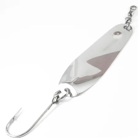 El níquel pulido proporciona un acabado de alto brillo a esta cucharilla metálica de 14g (1/2oz). Producido por Luhr Jensen en los EE. UU. bajo el código de producto 3341, el modelo McMahon sigue siendo una opción clásica para los equipos dedicados al curricán. Con una longitud de 10cm (4"), el señuelo presenta un perfil delgado y alargado diseñado para la estabilidad cuando se remolca detrás de una embarcación. El herraje consta de un emerillón de barril en la punta para mitigar la torsión de la línea y un gran anzuelo simple unido mediante un robusto anilla abierta en la parte trasera. Este espécimen específico está en condiciones 5/5, manteniendo su superficie reflectante como un espejo sin marcas ni desgaste. Luhr Jensen estableció su legado con estos diseños de metal troquelado, que utilizan la física simple para captar la luz y atraer la atención de los peces en diversas claridades de agua.