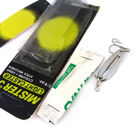 Con un tamaño de 1 1/2" (4 cm), el cuerpo metálico ranurado de este Luhr Jensen Mister J Light Caster está fabricado para alojar un stick luminoso químico para la pesca con poca luz. Esta cucharilla de 1/4 oz (7 g) presenta un acabado en Níquel pulido, que el embalaje original identifica como Cromo junto con un sello de fecha de producción de 12-88. El ejemplar se conserva sin usar en su blíster vintage original, que también contiene un stick luminoso Cyalume verde de 2,9 mm x 24 mm sellado. Estos sticks químicos se diseñaron originalmente para cumplir los estándares militares y de la OTAN, proporcionando un brillo constante para aumentar la visibilidad del señuelo en aguas profundas o turbias. Catalogado bajo el código de producto 10978, el conjunto incluye componentes estándar como un anzuelo triple afilado y un esmerillón de barril para evitar la torsión de la línea. Este artículo fabricado en USA, Oregón, ofrece una visión fascinante de las innovaciones técnicas para la pesca nocturna de finales de los años 80.