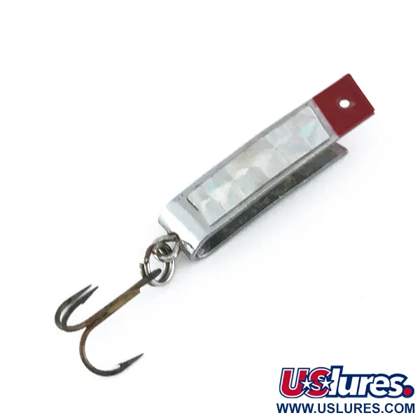 Con un peso ligero de 2,3 g (3/32 oz), el Super-Duper 501 presenta un acabado de níquel pulido diseñado para emitir destellos por toda la columna de agua. Este espécimen específico, identificado con el código de producto 8018, muestra el cuerpo metálico clásico en forma de 'U' que Luhr Jensen fabricaba en los EE. UU. Un lado del marco de 3 cm (1 1/4") está acentuado con una cinta prismática con patrón de cuadros que proporciona un contraste holográfico al metal. Una punta roja intensa en el enganche proporciona un punto de ataque tradicional que suele encontrarse en estas piezas vintage. El reverso mantiene una superficie metálica pulida y limpia donde las marcas de la marca están claramente estampadas en el níquel. Todo el hardware original, incluyendo la anilla abierta y el anzuelo triple, parece bien conservado, lo que garantiza una calificación de estado de 5/5. Un anzuelo triple con acabado bronceado está unido a la curva trasera del perfil único del señuelo.