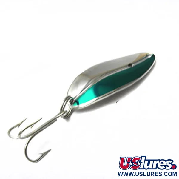 Un llamativo acabado reflectante verde azulado define un lado de esta cucharilla ondulante, contrastando bellamente con el cuerpo niquelado pulido. Con un peso de 11g (2/5oz) y una longitud de 5cm (2"), esta TODDCO Main liner es una pieza clásica de la artesanía estadounidense de los EE. UU. El cuerpo metálico presenta un marcado nervio longitudinal estampado en el centro, un detalle estructural común en las cucharillas de lance de mediados de siglo para aportar rigidez. Este espécimen específico, catalogado bajo el código de producto 0454, se mantiene en condiciones magníficas con una calificación de 5/5, mostrando una superficie brillante y limpia tanto en el níquel como en el destello de color. El montaje consiste en un único y afilado anzuelo triple asegurado por una anilla abierta de alta resistencia, lista para usar o exhibir. Un pequeño orificio para la línea está limpiamente perforado en la cabeza, manteniendo el perfil aerodinámico del esquema de color Nickel / Green.