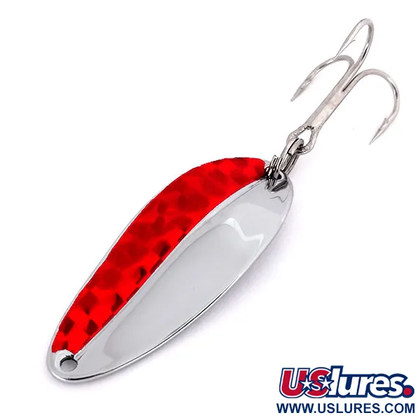 El níquel y los patrones de escamas rojas definen la llamativa estética de esta cucharilla ondulante americana vintage. Producida por TODDCO hasta 1980, la Main liner mide 5 cm (2") y presenta un acabado altamente pulido en una mitad de su cara y en todo el reverso. La sección roja está texturizada con una incrustación reflectante tipo escama que contrasta fuertemente con el níquel plateado. En la parte trasera lleva sujeta una potera afilada mediante una anilla abierta robusta, mientras que la cabeza está perforada para la conexión directa de la línea. Con un peso de 11 g (2/5 oz), el señuelo se identifica con el código de producto 10155 y mantiene una calificación de estado de 5/5. Este modelo fabricado en EE. UU. muestra las líneas limpias y los componentes típicos del material de pesca metálico de mediados de siglo.
