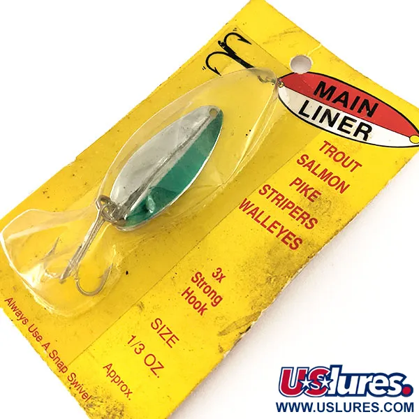 Con un peso de 11 g (2/5 oz) y una longitud de 5 cm (2"), la cucharilla Main liner es un clásico de la historia de la pesca de Michigan de TODDCO Products. El patrón de color Níquel / Verde ofrece un contraste distintivo, combinado con un anzuelo 3x fuerte diseñado para las embestidas de salmones o lucios. Identificado con el código 12335, el señuelo está sin usar y se conserva en su embalaje vintage original, con una calificación de estado de 6. Diseñado para trabajar en profundidad, se adapta fácilmente tanto al lance como al curricán. El reverso del cartón confirma su origen en Grand Rapids, ratificando su autenticidad como un señuelo de fabricación estadounidense anterior a los años 80.