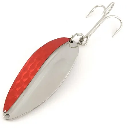 Una textura martillada cubre exactamente la mitad del cuerpo de esta cucharilla de 21 g (3/4 oz), creando un perfil visual de alto contraste. Conocida como Main Liner de TODDCO, con código de producto 21487, este señuelo de 6,5 cm (2 1/2") es un exponente de la fabricación de aparejos estadounidense de la época anterior a 1980. El esquema de color presenta una llamativa división entre níquel pulido y un rojo intenso, donde el lado rojo cuenta con una superficie hoyuecada que aporta profundidad física al metal. Viene montada con un anzuelo triple afilado y una anilla abierta robusta, mientras que un único orificio perforado en la parte frontal sirve como punto de enganche para la línea. Este ejemplar específico conserva un acabado excepcionalmente limpio, con una calificación de estado de 5/5. Su construcción en metal troquelado está equilibrada para un uso versátil tanto en lances como en pesca al curricán.