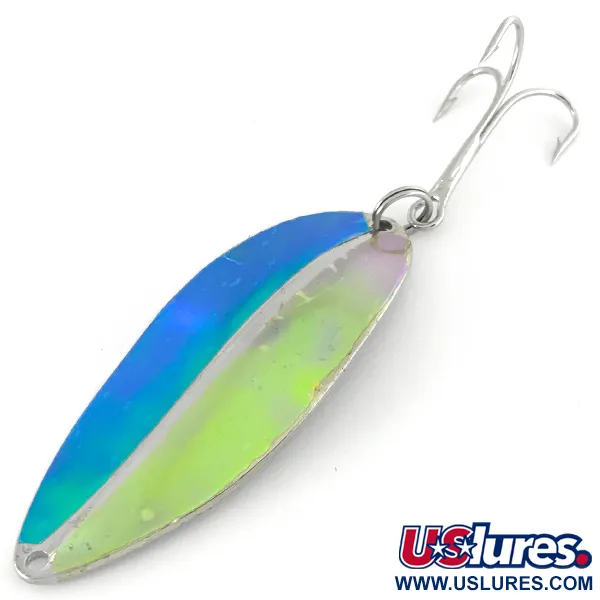 Con un peso de 3/4 oz (21 g), esta cucharilla ondulante de fabricación estadounidense cuenta con una distintiva quilla central que recorre toda la longitud de su cuerpo de 2 1/4" (6 cm). Fabricada por TODDCO en los EE. UU. hasta que terminó su producción en 1980, la Main liner sigue siendo un elemento básico para los coleccionistas de señuelos metálicos de mediados de siglo. El acabado Green / Nickel de este ejemplar, con el código de producto 7020, muestra un brillo iridiscente en la cara frontal que transita del azul profundo al verde lima intenso. En el reverso, el señuelo revela un dorso de níquel pulido diseñado para proporcionar el máximo destello. Con una valoración de estado 5/5, mantiene su brillo original de fábrica y está equipada con un robusto anzuelo triple plateado unido por una anilla abierta reforzada.