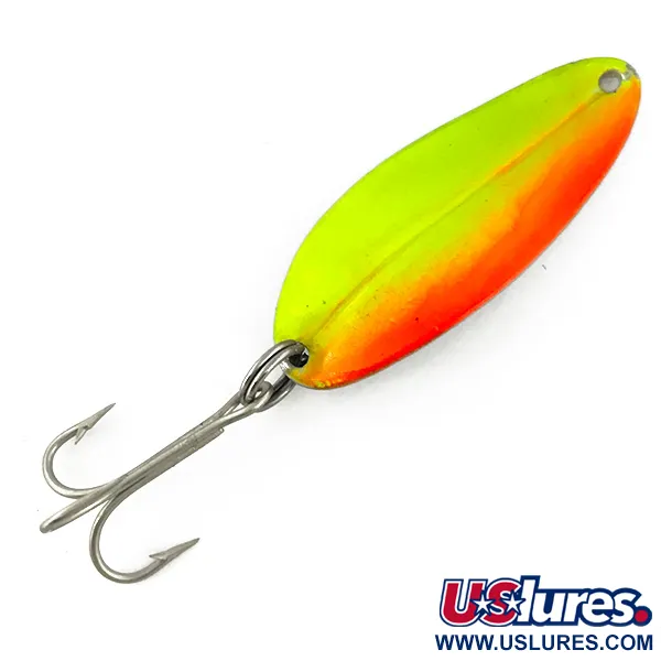 Con una longitud de 5 cm, el perfil de esta cucharilla ondulante presenta un llamativo acabado en dos tonos donde el chartreuse neón transiciona hacia un borde naranja intenso. Este ejemplar, identificado con el código de producto 3706, pertenece a la serie Toddco Main Liner UV, que la empresa estadounidense fabricó hasta aproximadamente 1980. La denominación UV es una característica funcional destacada, ya que la pintura está diseñada para emitir un brillo verde y naranja distintivo cuando se expone a la luz ultravioleta, aumentando la visibilidad en aguas turbias. Con un peso de 11 g (2/5 oz), el cuerpo de metal troquelado viene equipado con un anzuelo triple de tono plateado y una anilla abierta. Reflejando sus orígenes estadounidenses de mediados de siglo, el señuelo se conserva en excelentes condiciones con una calificación de 5/5, mostrando el brillo original de fábrica y herrajes limpios.